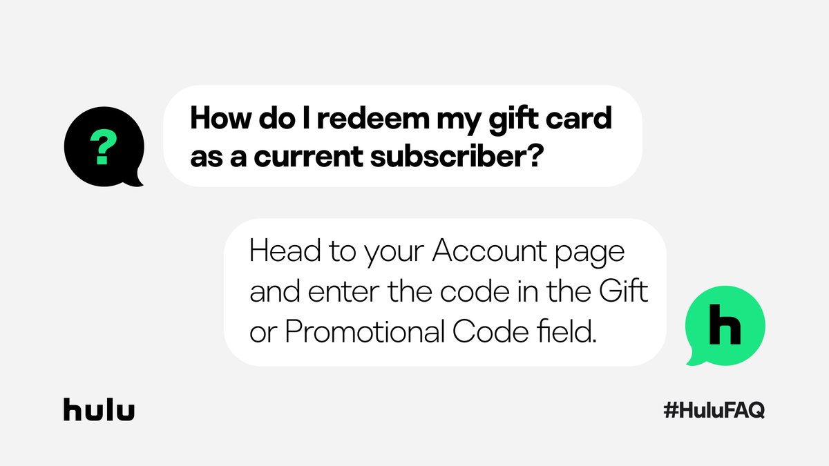 Hulu Gift Card | eGift Card | Virtual Cards | The Gift Card Shop Hulu gift subscriptions can be redeemed by visiting hulu.com/start/gifting and inputting the subscription code. When gift balance is expended, access to Hulu will end unless you provide another payment method, in which case monthly subscription charges will apply until you cancel. Remaining gift balance will be forfeited upon cancellation.