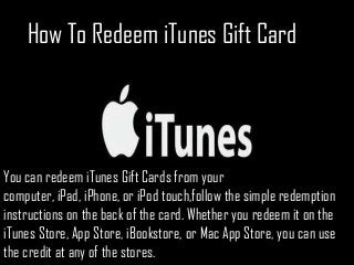 How to Redeem an iTunes Gift Card: 8 Steps (with Pictures) Tap "Redeem." In the text box, enter the 16-digit code on the back of your card. If you haven't already, scratch it off. Once you have entered it correctly, tap "Redeem" once more. Your new account balance will then be displayed. If you go to log onto a computer later, your new balance will be displayed there as well. 3 Buy away. Can iTunes only Gift Card (Not "App Store and iTunes Gift Card") for In ... Actually anything that you redeem to your apply ID can now be used for anything apple. The only exception to this is in store purchases. In store purchases can only use Everything Apple Gift Cards, and must remain on the physical card. But you can use your Apple ID balance in the apple store app, iTunes, App Store, etc. 2 Continue this thread How to Fix "Verification Required" for Apps Downloads on iPhone and iPad Open the "Settings" app on the iPhone or iPad. Choose "iTunes & App Store" settings, then tap on the "Apple ID: your@email.com" button at the top of the settings. Tap on "View Apple ID" and sign in to the Apple ID as usual. In the Account Settings section, tap on "Payment Information". Under 'Payment Method', choose ...