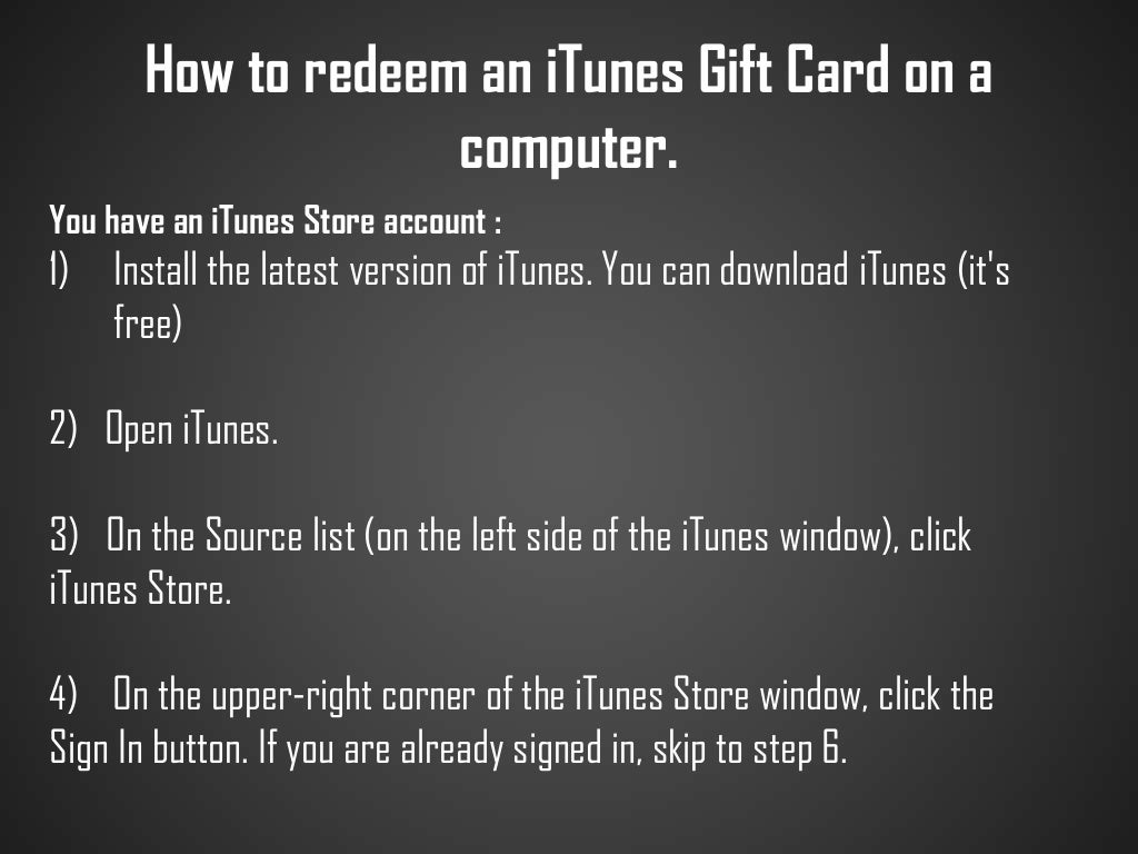 Check to see if iTunes Gift Cards have been redeemed? As a first step to check the iTunes codes, I opened up iTunes 11 and clicked on the iTunes Store button. On the right side the following options show up: Click on "Redeem" to continue and it'll ask you to log in again to your iTunes account: Well, don't log in to my account, please. 🙂. Once you've logged in, however, you'll get ...