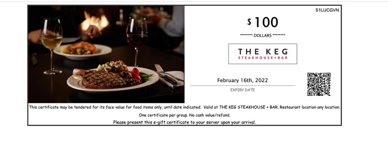 $200 Gift Card to The Keg Steakhouse + Bar $200 Gift Card to The Keg Steakhouse + Bar Courtesy of The Keg. Item is Closed; Description; Fine Print; Shipping; Back to Auction. Use $200 towards The Keg for lunch, dinner, or dessert at The Keg! No expiry date. Once payment is finalized, you can pick up your item(s) at our main office during our business hours listed below. Please be ...