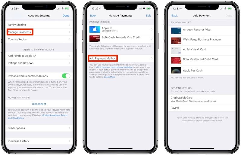 Payment methods that you can use with your Apple ID Apple ID balance (from redeeming Apple Gift Card or adding funds) United States of America Apple Card Apple Pay 1 Apple Cash Most credit and debit cards PayPal 2 Apple ID balance (from redeeming Apple Gift Card or adding funds) Latin America and the Caribbean Anguilla Most credit and debit cards Antigua and Barbuda Most credit and debit cards